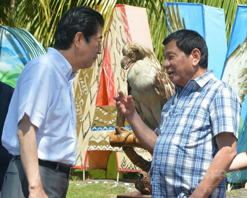 【1月13日 AFP】フィリピンを訪問中の安倍晋三(Shinzo Abe)首相は13日、ロドリゴ・ドゥテルテ(Rodrigo Duterte)大統領の地元・南部ミンダナオ(Mindanao)島のダバオ(Davao)市で、同国の国鳥に指定されているフィリピンワシの命名式に出席した。