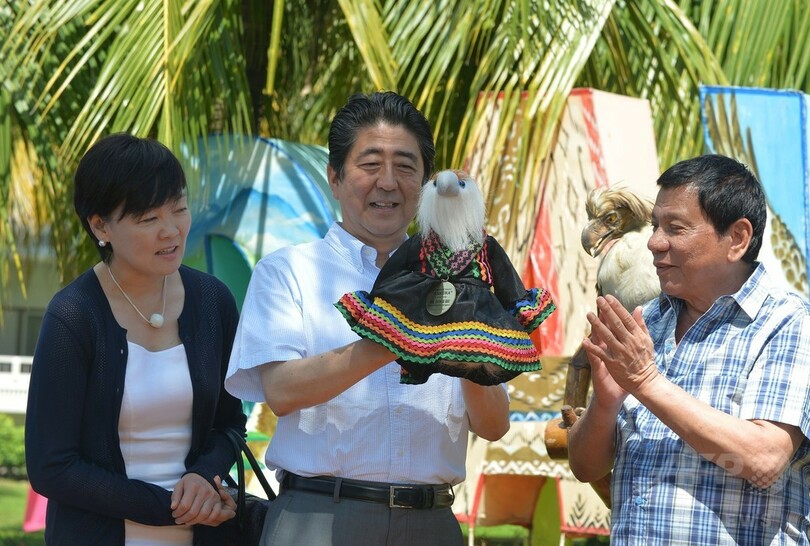 【1月13日 AFP】フィリピンを訪問中の安倍晋三(Shinzo Abe)首相は13日、ロドリゴ・ドゥテルテ(Rodrigo Duterte)大統領の地元・南部ミンダナオ(Mindanao)島のダバオ(Davao)市で、同国の国鳥に指定されているフィリピンワシの命名式に出席した。