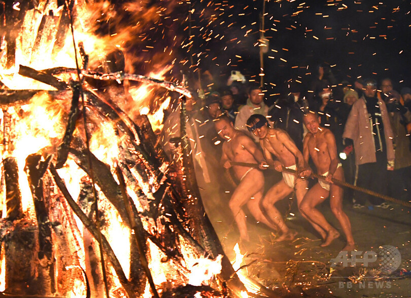 火柱とふんどし男衆 豪壮な火祭り「左義長」 大磯
