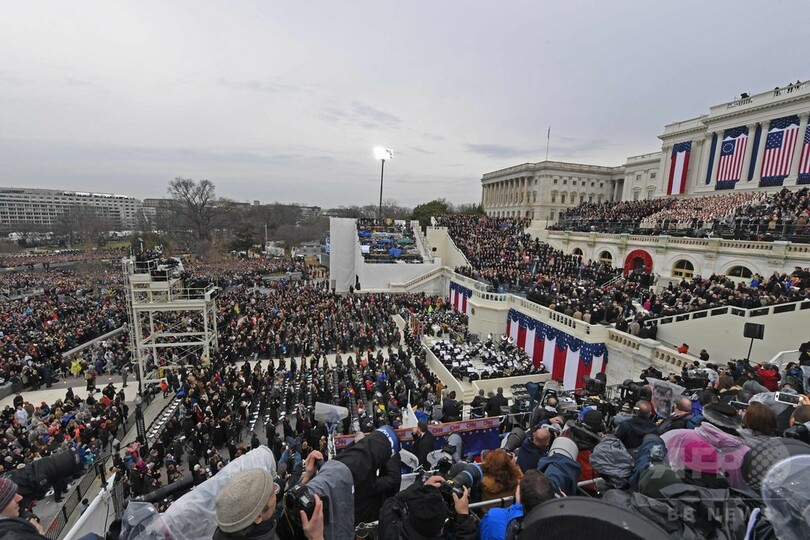 米首都ワシントン(Washington D.C.)の連邦議会議事堂前で行われた就任宣誓式でトランプ氏は、エーブラハム・リンカーン(Abraham Lincoln)大統領が使用したものを含む2冊の聖書に手を置き、「私、ドナルド・ジョン・トランプは、米大統領の職務を忠実に遂行し、合衆国憲法を保存し、保護し、守ることに全力を尽くしていく」と誓った。(c)AFP