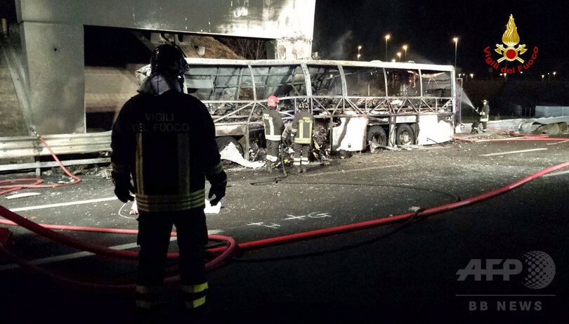 ニュース 社会 伊北部でバス衝突事故、16人死亡 2017年1月21日 20:18 発信地:ローマ/イタリア [ ヨーロッパ イタリア ] このニュースをシェア ‹ › ❮ 3/4 ❯ イタリア北部ベローナで、高速道路を走行中に衝突事故を起こし炎上したバス。伊消防当局が提供(2017年1月21日提供)。(c)AFP/VIGILI DEL FUOCO 画像作成中 ! 【1月21日 AFP】(写真追加)イタリア北部ベローナ(Verona)付近の高速道路で20日夜、ハンガリーの10代の若者たちを乗せたバスが事故を起こし、16人が死亡し、36人が負傷した。消防当局が21日、明らかにした。 消防当局によるとバスは柱に衝突して炎上した。バスには乗客約50人が乗っており、大半は16~18歳のハンガリー人だったという。 イタリアのAGI通信は、バスは学校の旅行で訪れたフランスから帰る途中で、運転していたフランス人とその家族も死亡した恐れがあると報じている。(c)AFP 社会 一覧へ> メディア・報道関係・法人の方向け 写真・動画 購入のお問合せ>