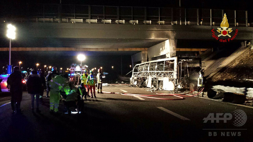 ニュース 社会 伊北部でバス衝突事故、16人死亡 2017年1月21日 20:18 発信地:ローマ/イタリア [ ヨーロッパ イタリア ] このニュースをシェア ‹ › ❮ 4/4 ❯ イタリア北部ベローナで、高速道路を走行中に衝突事故を起こし炎上したバスの消火活動にあたる消防隊員。伊消防当局が提供(2017年1月21日提供)。(c)AFP/VIGILI DEL FUOCO 画像作成中 ! 【1月21日 AFP】(写真追加)イタリア北部ベローナ(Verona)付近の高速道路で20日夜、ハンガリーの10代の若者たちを乗せたバスが事故を起こし、16人が死亡し、36人が負傷した。消防当局が21日、明らかにした。 消防当局によるとバスは柱に衝突して炎上した。バスには乗客約50人が乗っており、大半は16~18歳のハンガリー人だったという。 イタリアのAGI通信は、バスは学校の旅行で訪れたフランスから帰る途中で、運転していたフランス人とその家族も死亡した恐れがあると報じている。(c)AFP 社会 一覧へ> メディア・報道関係・法人の方向け 写真・動画 購入のお問合せ>