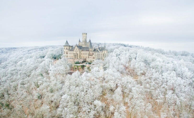 【1月24日 AFP】ドイツ中部パッテンゼン(Pattensen)近郊で18日に撮影されたドローン(無人機)による航空写真。上空からは、雪で覆われた森の中にマリエンブルク城(the Marienburg Castle)がたたずむ幻想的な風景が見られた。(c)AFP
