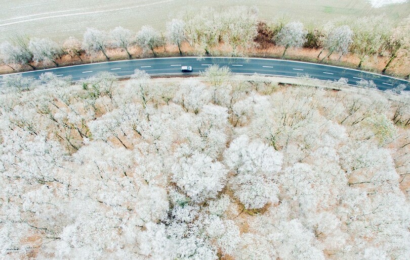 【1月24日 AFP】ドイツ中部パッテンゼン(Pattensen)近郊で18日に撮影されたドローン(無人機)による航空写真。上空からは、雪で覆われた森の中にマリエンブルク城(the Marienburg Castle)がたたずむ幻想的な風景が見られた。(c)AFP