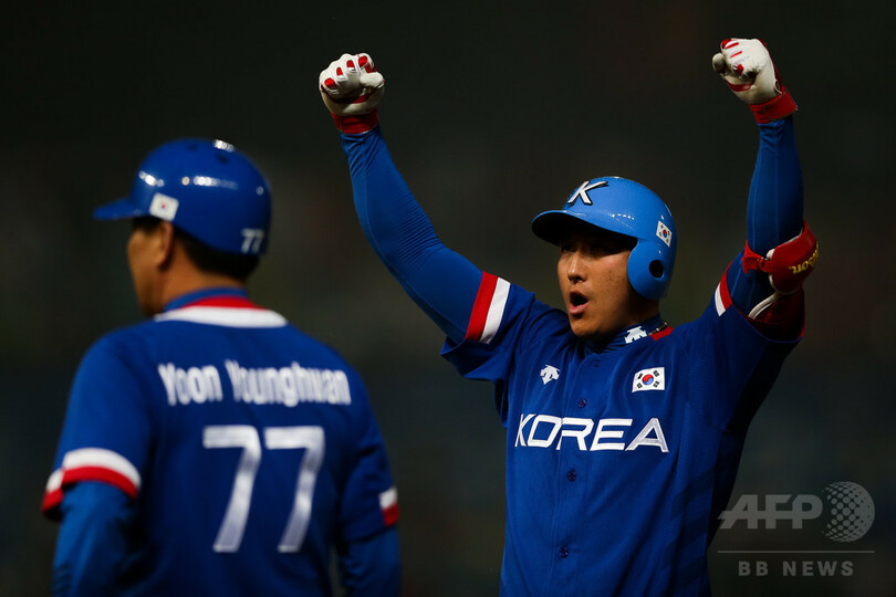 黄は、韓国プロ野球のロッテ・ジャイアンツ(Lotte Giants)で6年間プレーし、昨シーズンはキャリア最高となる27本塁打、113打点を記録。さらに前シーズンは122個喫していた三振を66にまで減らしている。(c)AFP