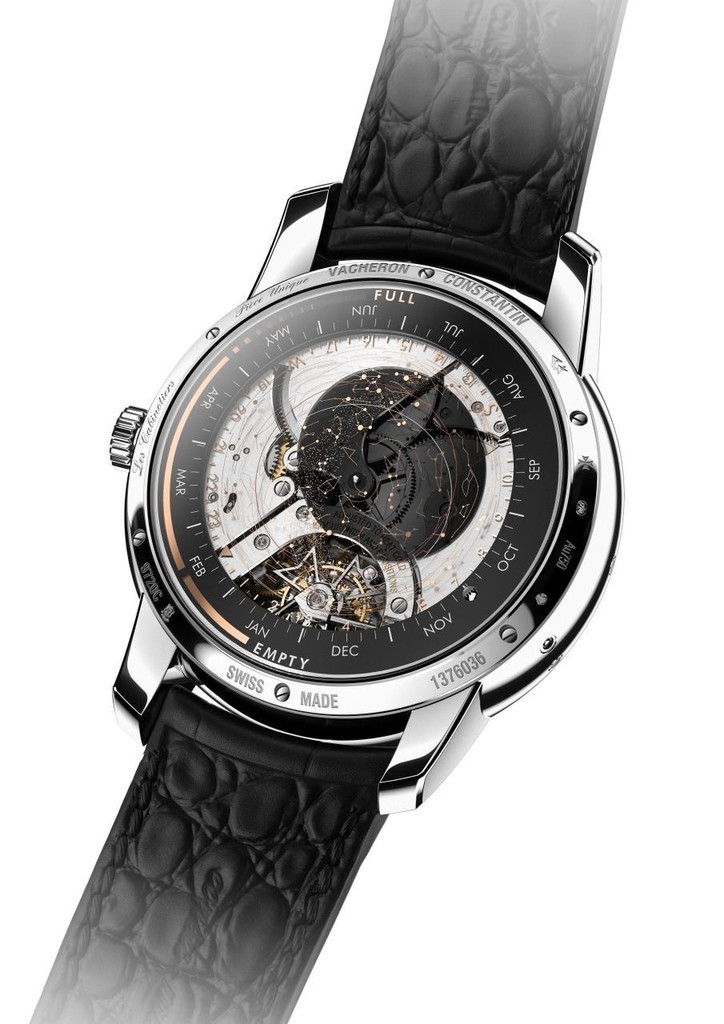 表側の文字盤は、常用時表示、太陽時表示、さらに地球-月-太陽の位置関係を示す潮汐表示が配されている。裏側の文字盤には、恒星時を表示する透明な天空図が描かれている。星座、銀河、天体の赤道、黄道が示されているこの天体図は、2枚のサファイアクリスタルのディスクを重ね合わせるという画期的な手法で実現した。