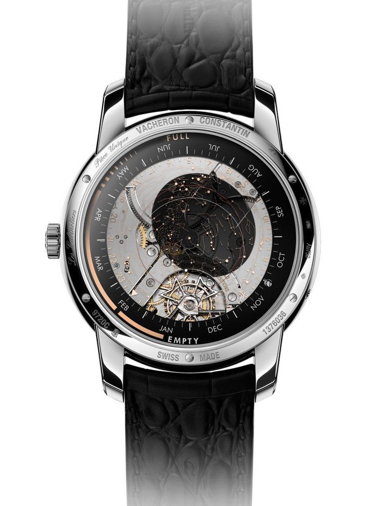 表側の文字盤は、常用時表示、太陽時表示、さらに地球-月-太陽の位置関係を示す潮汐表示が配されている。裏側の文字盤には、恒星時を表示する透明な天空図が描かれている。星座、銀河、天体の赤道、黄道が示されているこの天体図は、2枚のサファイアクリスタルのディスクを重ね合わせるという画期的な手法で実現した。