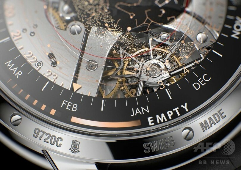 表側の文字盤は、常用時表示、太陽時表示、さらに地球-月-太陽の位置関係を示す潮汐表示が配されている。裏側の文字盤には、恒星時を表示する透明な天空図が描かれている。星座、銀河、天体の赤道、黄道が示されているこの天体図は、2枚のサファイアクリスタルのディスクを重ね合わせるという画期的な手法で実現した。