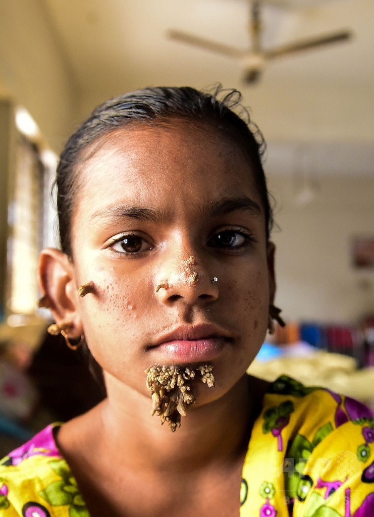 サハナ・カトゥン(Sahana Khatun)さん(10)の顎、耳、鼻には、節くれ立ったイボができており、ダッカ医科大学病院(Dhaka Medical College Hospital)の医師らは、カトゥンさんの症状が「疣贅(ゆうぜい)状表皮発育異常症」と診断できるのかどうか、現在調査を進めている。