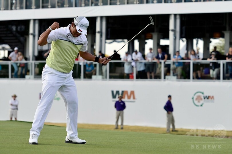 この勝利で松山は、今大会で予選通過を逃したジャスティン・トーマス(Justin Thomas、米国)を抜き、フェデックス・カップ(FedEx Cup 2017)の首位に浮上している。(c)AFP