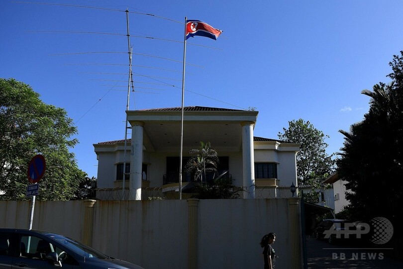 この病院にある法医学部門の建物の外では、北朝鮮の国旗を掲げた黒いジャガー(Jaguar)製セダンに乗って、国旗をあしらったピンバッジを着用した北朝鮮の当局者4人が現れたが、現地時間の午後8時(日本時間午後9時)頃、報道陣に応じることなく立ち去った。(c)AFP/M JEGATHESAN, with Park Chan-Kyong in Seoul