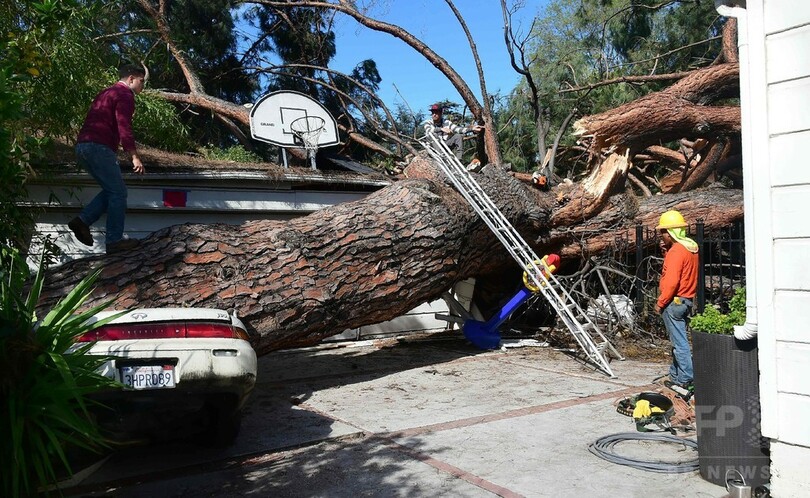 【2月16日 AFP】米カリフォルニア(California)州パサデナ(Pasadena)で15日、樹齢100年を数える、高さ36メートル以上の松の巨木が倒れ、家屋の壁と駐車中の車を押しつぶした。けが人はいなかった。