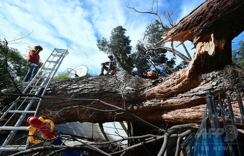 【2月16日 AFP】米カリフォルニア(California)州パサデナ(Pasadena)で15日、樹齢100年を数える、高さ36メートル以上の松の巨木が倒れ、家屋の壁と駐車中の車を押しつぶした。けが人はいなかった。
