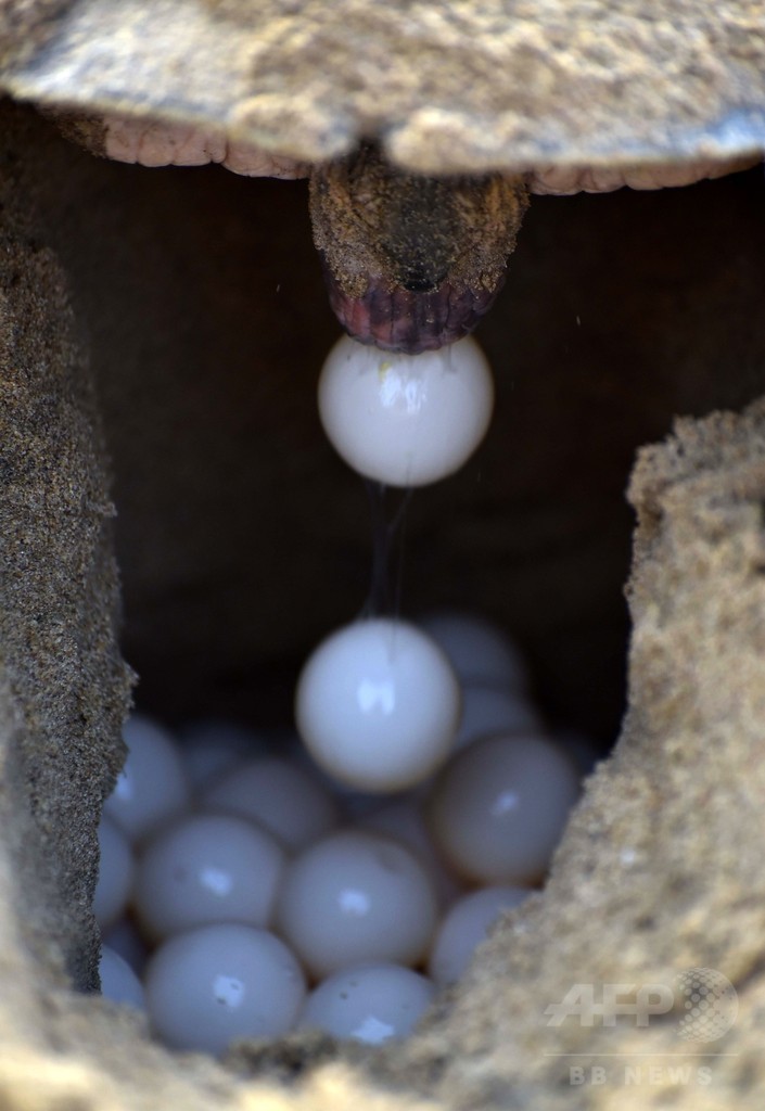 【2月17日 AFP】インド東部オディシャ(Odisha)州の浜辺にここ数日、産卵のために数千匹ものヒメウミガメ(学名:Lepidochelys olivacea)が上陸している。インド洋のベンガル湾(Bay of Bengal)に面するこのラッシカルヤビーチ(Rushikulya Beach)は、オディシャ州に3か所ある大規模な繁殖地の一つ。(c)AFP
