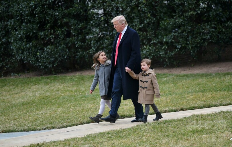 【2月18日 AFP】米国のドナルド・トランプ(Donald Trump)大統領は17日、ホワイトハウス(White House)南庭「サウスローン(South Lawn)」を孫のアラベラ・クシュナー(Arabella Kushner)ちゃん、ジョセフ・クシュナー(Joseph Kushner)君と手をつないで歩き、米大統領専用ヘリコプター「マリーンワン(Marine One)」に乗り込んだ。(c)AFP