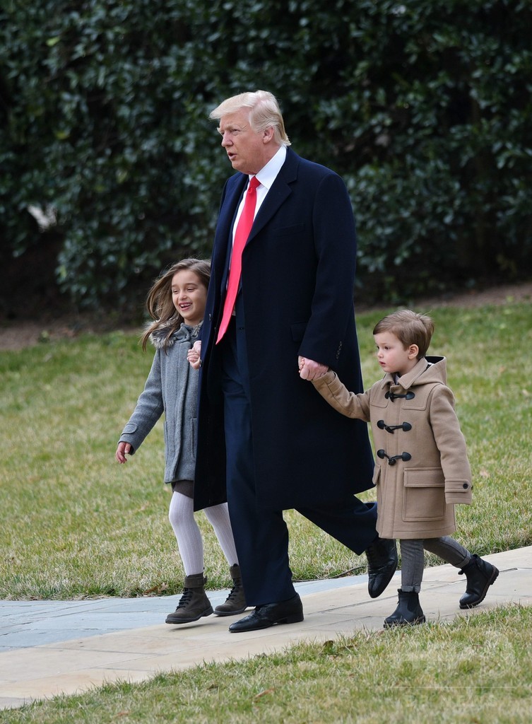 【2月18日 AFP】米国のドナルド・トランプ(Donald Trump)大統領は17日、ホワイトハウス(White House)南庭「サウスローン(South Lawn)」を孫のアラベラ・クシュナー(Arabella Kushner)ちゃん、ジョセフ・クシュナー(Joseph Kushner)君と手をつないで歩き、米大統領専用ヘリコプター「マリーンワン(Marine One)」に乗り込んだ。(c)AFP