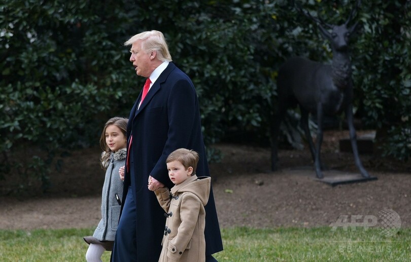 【2月18日 AFP】米国のドナルド・トランプ(Donald Trump)大統領は17日、ホワイトハウス(White House)南庭「サウスローン(South Lawn)」を孫のアラベラ・クシュナー(Arabella Kushner)ちゃん、ジョセフ・クシュナー(Joseph Kushner)君と手をつないで歩き、米大統領専用ヘリコプター「マリーンワン(Marine One)」に乗り込んだ。(c)AFP