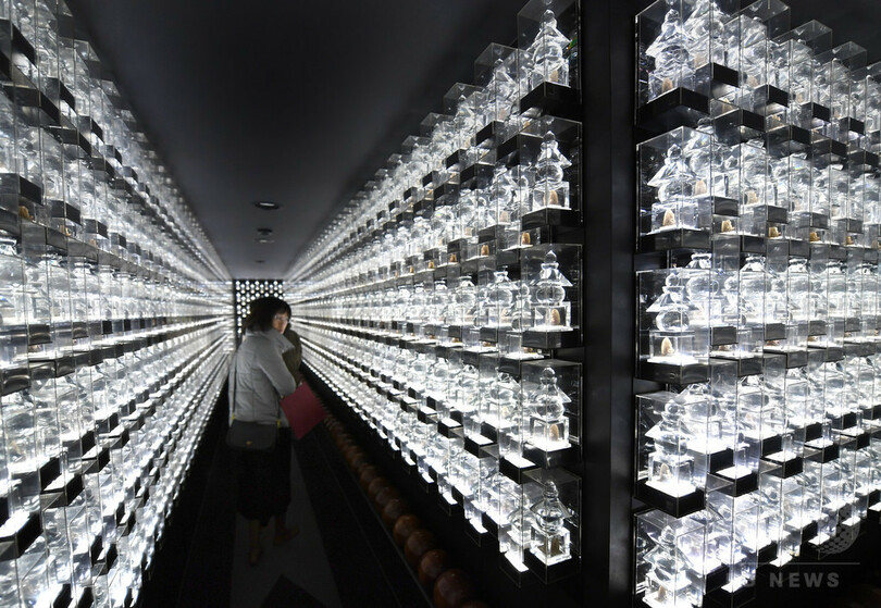 こうした設計は、「ご利益」の視覚的体験を試みたものだという。不動堂総務部は、クリスタル五輪塔はあくまでも「鑑賞用でなく、拝む対象」とマナーを守った参拝を呼び掛けている。(c)AFPBB News