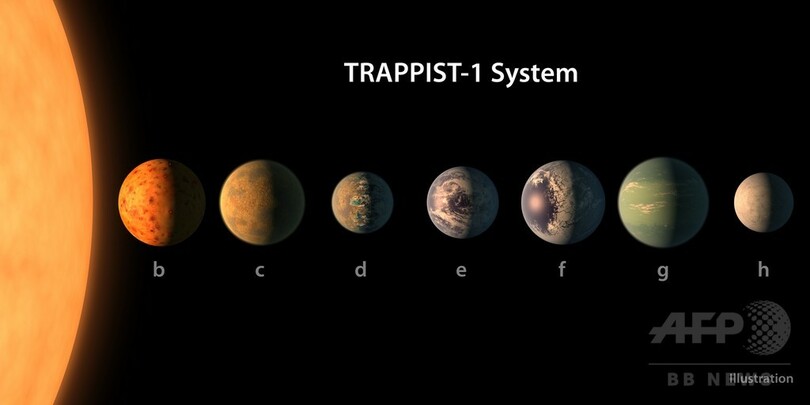 1恒星を公転する地球サイズの惑星の数は、トラピスト1星系の7個が観測史上最多。さらに、水が液体のまま存在できる領域内にある惑星の数も観測史上最も多いという。(c)AFP