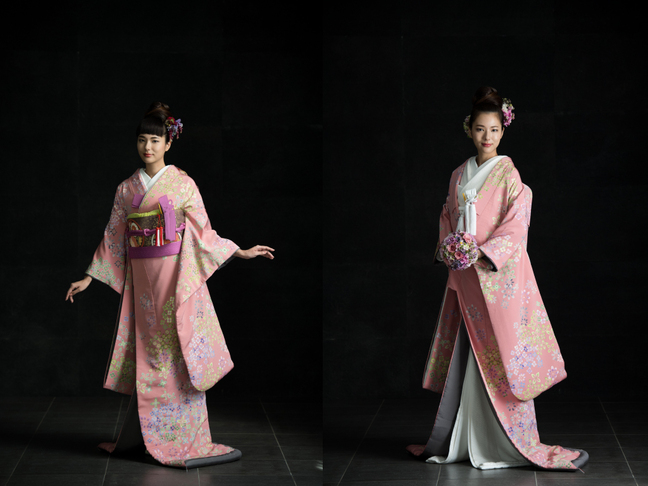 しかもそのアジサイを丸ごと柄に生かすのではなく、フラワーアーティストならではの視線で、ガクアジサイやカシワバアジサイなど様々な花弁をミックスさせた。打ち掛けと振り袖の生地は、大人っぽいピンクと上品なライトブルーの2色展開。また裏地には相性の良いグレーを使い、華やかさと渋さを併せもつ特別な一着に仕上がった。背中の襟下に彼のイニシャルである「N」と「B」をかたどった花紋が刺繍されているのも、さりげないサプライズだ。