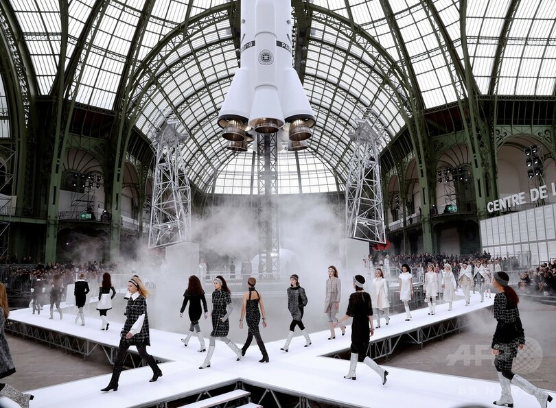 ラガーフェルドは、ストリートスタイルと宇宙的モチーフを「シャネル」のクラシックなスタイルとミックス。モデルたちは60年代のSFヒロイン「バーバレラ(Barbarella)」風のふっくらしたヘアに、キラキラした銀色のブーツを合わせた。何人かのモデルはドレスの下にツイードのバミューダパンツを穿いており、それは宇宙旅行にはもちろん、「サイクリング」にもぴったりだとラガーフェルドは語った。(c)Fiachra GIBBONS/AFP