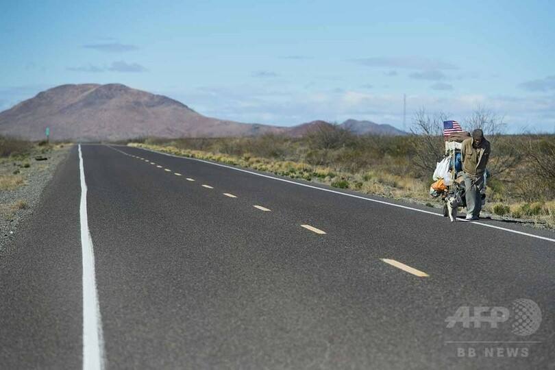 この旅で出会った中でも特に風変りだったのが、放浪の民を自称するクリス・カークランド(Chris Kirkland)さんだった。ニューメキシコ(New Mexico)州コロンバス(Columbus)の外れで、台車を引きながら犬と一緒に幹線道路を歩いていたカークランドさんが目に留まった。