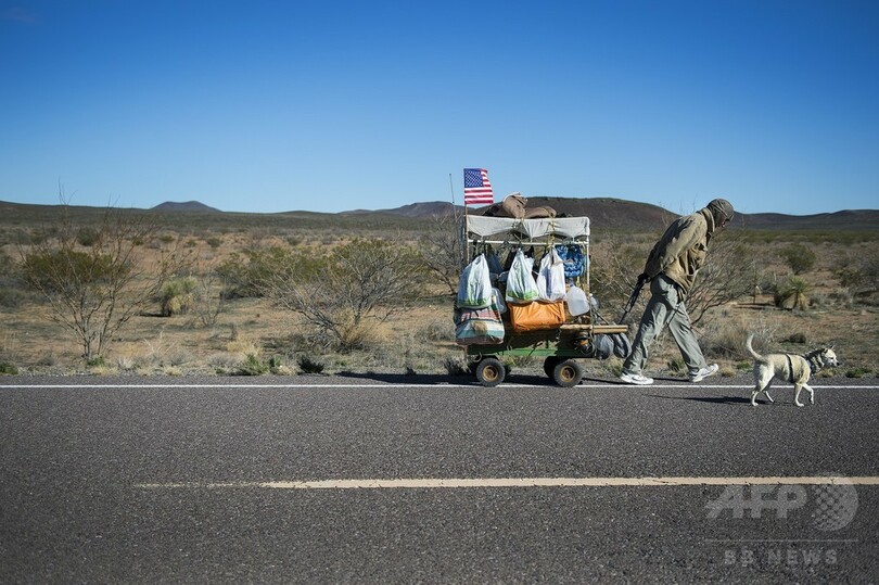 この旅で出会った中でも特に風変りだったのが、放浪の民を自称するクリス・カークランド(Chris Kirkland)さんだった。ニューメキシコ(New Mexico)州コロンバス(Columbus)の外れで、台車を引きながら犬と一緒に幹線道路を歩いていたカークランドさんが目に留まった。