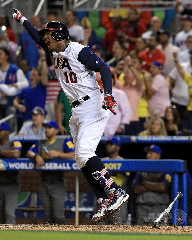 【3月11日 AFP】第4回ワールド・ベースボール・クラシック(2017 World Baseball Classic、WBC)は10日、米マイアミ(Miami)で1次ラウンド・プールCの試合が行われ、米国は延長10回裏にアダム・ジョーンズ(Adam Jones)がサヨナラ安打を放ち、コロンビアに3-2で劇的勝利を収めた。