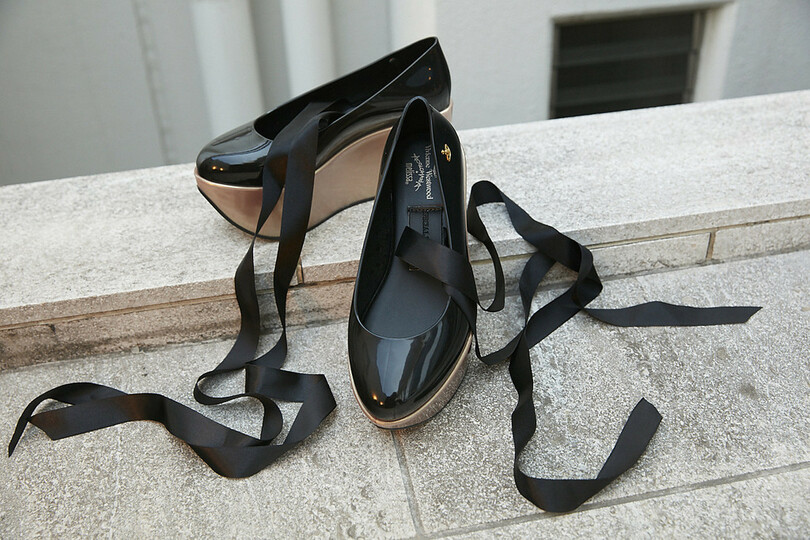 「ヴィヴィアン・ウエストウッド」を象徴するプラットフォームシューズ「ロッキンホース・バレリーナ」は、2016年秋冬シーズンに発表され、人気を集めた。リサイクル可能なプラスチックシューズで知られる「メリッサ」は、プラットフォームのベース、アンクルリボンといったオリジナルのデザインを見事に再現。今季はブラック×ゴールドのスペシャルエディションで登場する。