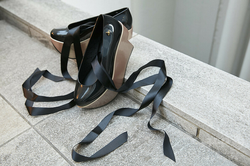「ヴィヴィアン・ウエストウッド」を象徴するプラットフォームシューズ「ロッキンホース・バレリーナ」は、2016年秋冬シーズンに発表され、人気を集めた。リサイクル可能なプラスチックシューズで知られる「メリッサ」は、プラットフォームのベース、アンクルリボンといったオリジナルのデザインを見事に再現。今季はブラック×ゴールドのスペシャルエディションで登場する。