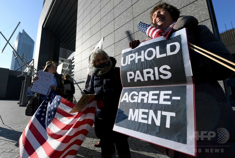 来日中の米国務長官にパリ協定への責任訴え、在日米国人がデモ