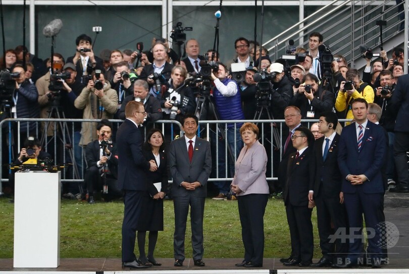 【3月20日 AFP】(写真追加)安倍晋三(Shinzo Abe)首相は19日、独ハノーバー(Hanover)の世界最大級の情報通信技術見本市「セビット(CeBIT)」に登場し、ドイツのアンゲラ・メルケル(Angela Merkel)首相と共に開幕前夜の会場であいさつのスピーチを行った。20日から24日まで開催の今年の同見本市では、日本がパートナー国として参加している。