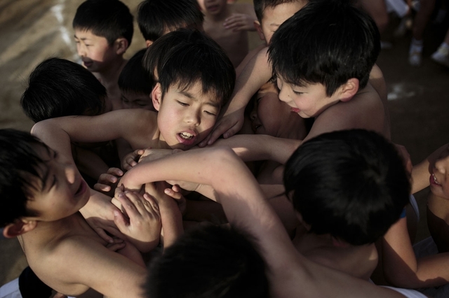 事実、大人たちの前には子どもたちの裸祭りもあった。規模が小さいだけで基本的には同じだ。少年たちが円形に集まったところに住職がはしごの上から小さな宝木を投げ入れると、争奪戦が始まった。僧侶たちは注意深く見守っているが、子どもたちは戦いを始めると、本気で戦う。