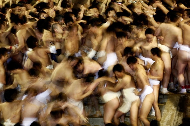 後で分かったことだが、祭りの名称は少し紛らわしい。男たちは全裸ではなく、相撲力士のまわしのように、ふんどしを巻いていた。競り合いがどれだけ激しいものになるかを物語る慣習がある。男たちは重傷を負ったときに救急隊員に知らせるため、儀式の前に自分の血液型を書いた名札をふんどしに挟んでおくのだ。