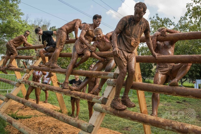 主催者によると地元イスラエルはもとより、フランス、米国、ポーランド、ウクライナなどから集まった男女約5000人が最大で22の障害物に挑戦。ぶら下がったロープを伝ったり、斜面をよじ登ったり、冷水の中をはって進むなどして、最後は泥だらけで倒れ込む参加者も続出した。