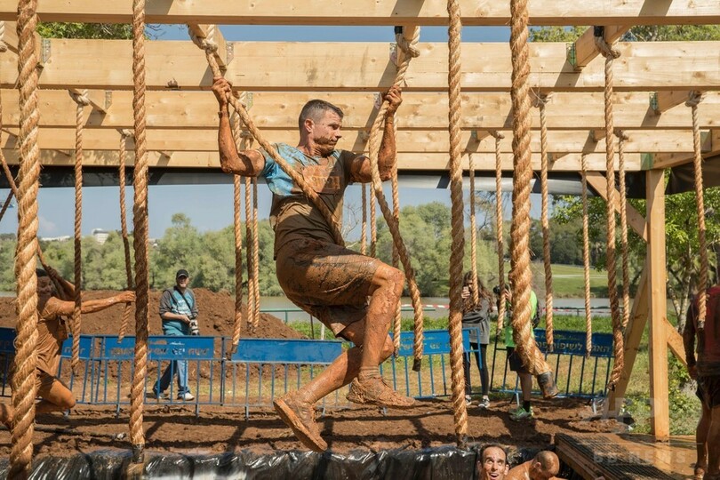 主催者によると地元イスラエルはもとより、フランス、米国、ポーランド、ウクライナなどから集まった男女約5000人が最大で22の障害物に挑戦。ぶら下がったロープを伝ったり、斜面をよじ登ったり、冷水の中をはって進むなどして、最後は泥だらけで倒れ込む参加者も続出した。