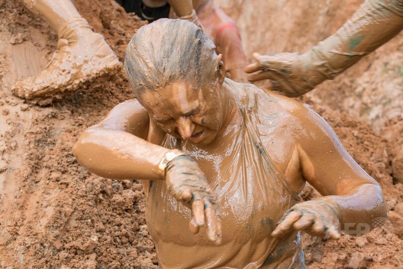 泥んこ障害物競走は2013年に仏パリ(Paris)で初開催され、その後、スペイン、ベルギー、スイスにも広がっている。(c)AFP