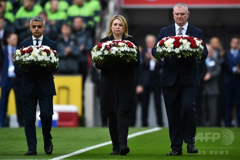 また試合前には、22日に英ロンドン(London)の国会議事堂近くで起きた襲撃事件の4人の犠牲者と50人以上の負傷者を悼み、花と1分間の黙とうがささげられた。(c)AFP/Tom WILLIAMS