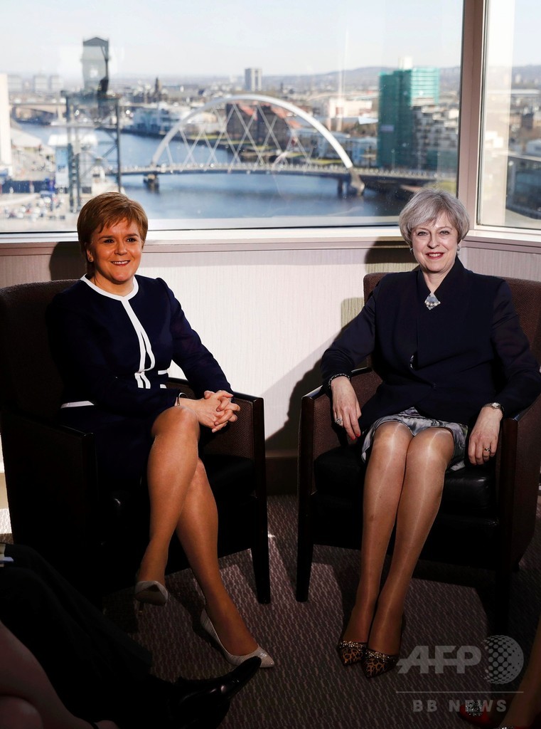 29日に欧州連合(EU)からの離脱通告を行う予定のメイ氏と、スコットランド独立の是非を問う住民投票を推し進めるスタージョン氏は27日、グラスゴー(Glasgow)のホテルで会談し、英国のEU離脱(ブレグジット、Brexit)をめぐり対立する意見を交わした。
