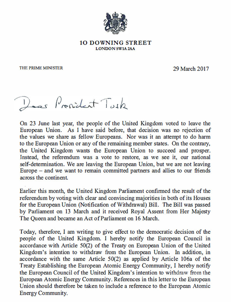 AFPの記者によれば、テリーザ・メイ(Theresa May)英首相が署名した書簡を、同国のティム・バロウ(Tim Barrow)駐EU大使が、ベルギーの首都ブリュッセル(Brussels)にあるトゥスク氏の執務室に届けたという。