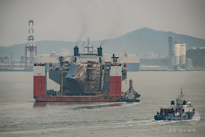 現場のAFPカメラマンによると、セウォル号を載せた半潜水型の運搬船は南西部にある木浦(Mokpo)の港の埠頭(ふとう)に横付けする形で接岸した。