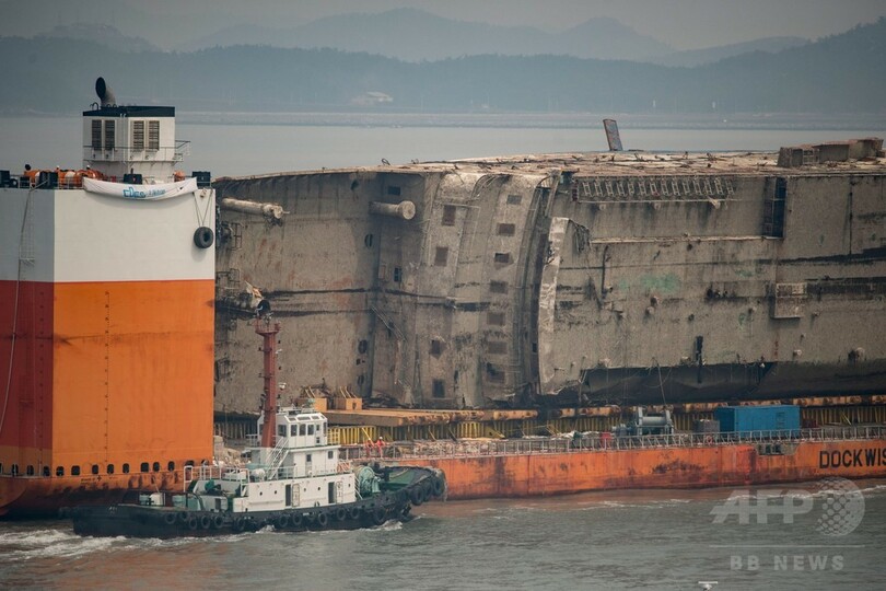 現場のAFPカメラマンによると、セウォル号を載せた半潜水型の運搬船は南西部にある木浦(Mokpo)の港の埠頭(ふとう)に横付けする形で接岸した。