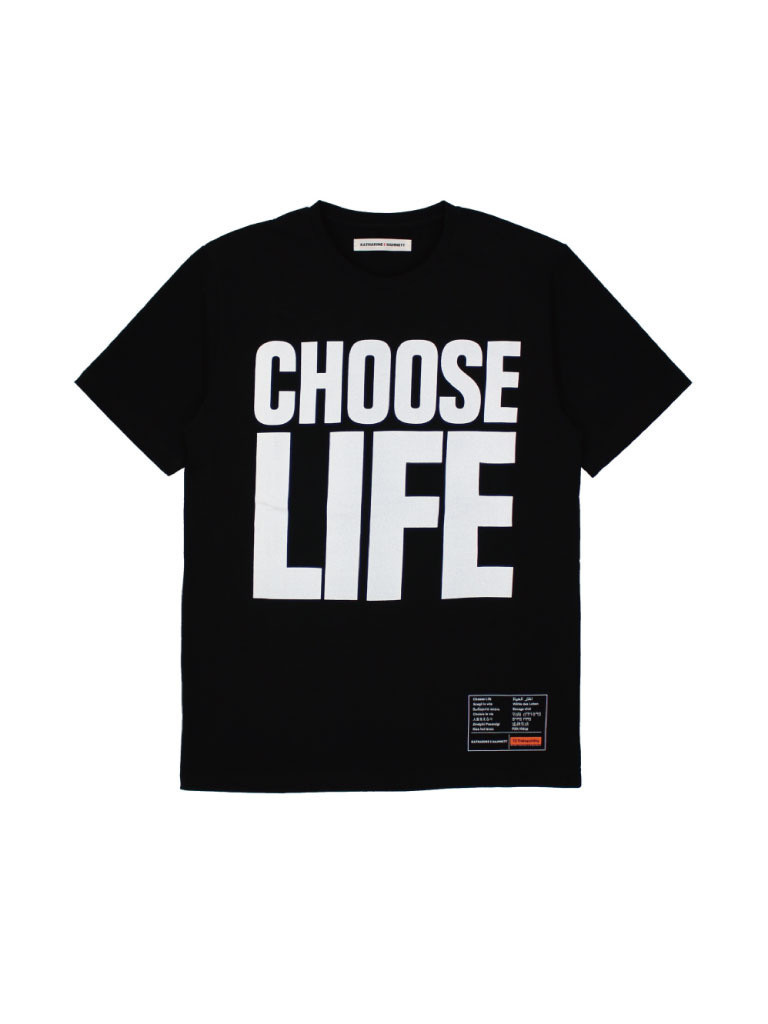 前作の冒頭に登場する「CHOOSE LIFE(人生を選べ)」という言葉に、デザイナーのキャサリン・ハムネット(Katharine Hamnett)が共感したことで今回のコラボに至ったという。キャサリンは、1983年より反核や平和のスローガンを掲げたTシャツやコレクションを発表し続けており、代表的な“CHOOSE LIFE”Tシャツは、イギリスの二人組ミュージシャン、「ワム!(Wham!)」のメンバーであるジョージ・マイケル(George Michael)が着用していたことでも有名だ。