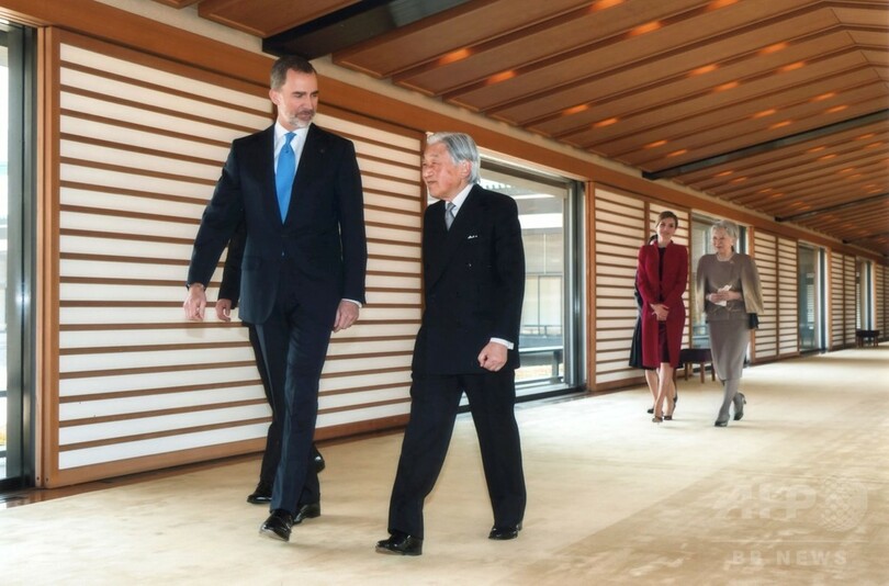 ニュース ライフ スペイン国王夫妻、皇居を訪問 両陛下と懇談 2017年4月5日 17:23 発信地:東京 [ アジア・オセアニア 東京 ] このニュースをシェア ‹ › ❮ 3/3 ❯ 天皇、皇后両陛下と皇居内を歩く、スペイン国王のフェリペ6世(手前右)、妻のレティシア王妃(後方左、2017年4月5日撮影)。(c)AFP/Imperial Household Agency of Japan 画像作成中 ! 【4月5日 AFP】来日中のスペイン国王のフェリペ6世(King Felipe VI)と妻のレティシア王妃(Queen Letizia)が5日、皇居を訪れ、天皇、皇后両陛下と懇談した。(c)AFP ライフ 一覧へ> メディア・報道関係・法人の方向け 写真・動画 購入のお問合せ>