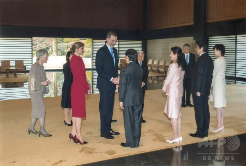 ニュース ライフ スペイン国王夫妻、皇居を訪問 両陛下と懇談 2017年4月5日 17:23 発信地:東京 [ アジア・オセアニア 東京 ] このニュースをシェア ‹ › ❮ 2/3 ❯ 皇居で、天皇、皇后両陛下、皇太子ご夫妻、安倍晋三首相、昭恵夫人の出迎えを受ける、スペイン国王のフェリペ6世(左から4番目)と妻のレティシア王妃(左から3番目、2017年4月5日撮影)。(c)AFP/Imperial Household Agency of Japan 画像作成中 ! 【4月5日 AFP】来日中のスペイン国王のフェリペ6世(King Felipe VI)と妻のレティシア王妃(Queen Letizia)が5日、皇居を訪れ、天皇、皇后両陛下と懇談した。(c)AFP ライフ 一覧へ> メディア・報道関係・法人の方向け 写真・動画 購入のお問合せ>