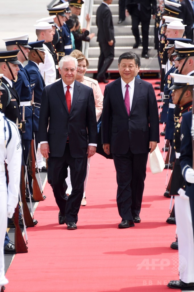 習主席を乗せた航空機は午後1時半(日本時間7日午前2時半)ごろ、パームビーチ国際空港(Palm Beach International Airport)に着陸。空港に降り立った習主席は、儀仗(ぎじょう)兵やレックス・ティラーソン(Rex Tillerson)米国務長官に迎えられた。(c)AFP