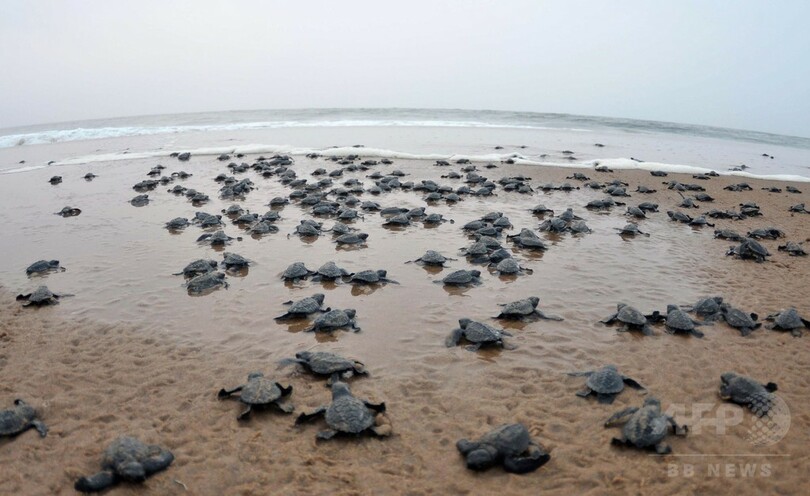【4月8日 AFP】ヒメウミガメの産卵地として知られるインド東部オディシャ(Odisha)州ガンジャム(Ganjam)県のラッシカルヤ(Rushikulya Beach)の砂浜で8日、ふ化した無数の赤ちゃんガメがベンガル湾(Bay of Bengal)へ入っていった。中には海に向かう途中で漁網にかかり、逃げ出そうともがく赤ちゃんガメもいた。(c)AFP