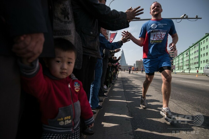 平壌で国際マラソン大会、外国人ランナーとハイタッチも 北朝鮮