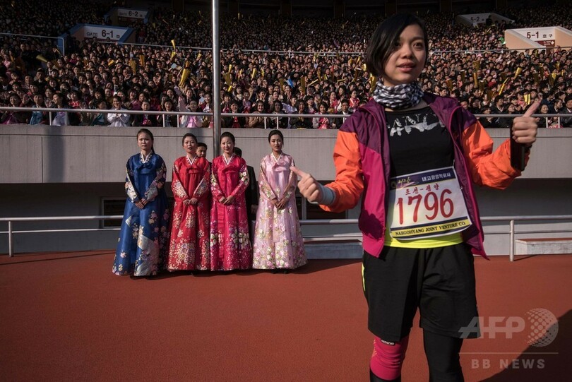 収容人数が4万人を超える金日成競技場を埋め尽くした観客たちは、ランナーたちが人工芝のフィールドに姿をみせると熱烈に称賛した。競技場には、金正恩(キム・ジョンウン、Kim Jong-Un)朝鮮労働党委員長の祖父、故・金日成(キム・イルソン、Kim Il-Sung)国家主席と、父の故・金正日(キム・ジョンイル、Kim Jong-Il)総書記の肖像画が飾られ、笑顔で競技場を見下ろしている。