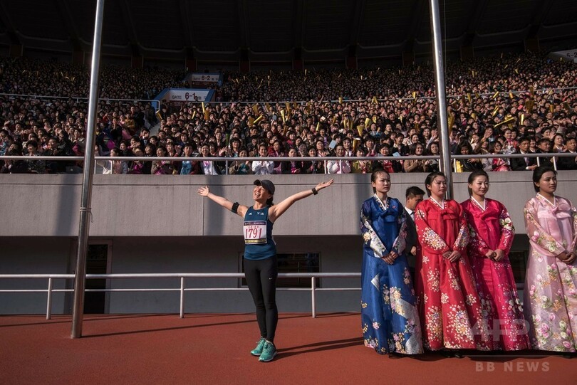 収容人数が4万人を超える金日成競技場を埋め尽くした観客たちは、ランナーたちが人工芝のフィールドに姿をみせると熱烈に称賛した。競技場には、金正恩(キム・ジョンウン、Kim Jong-Un)朝鮮労働党委員長の祖父、故・金日成(キム・イルソン、Kim Il-Sung)国家主席と、父の故・金正日(キム・ジョンイル、Kim Jong-Il)総書記の肖像画が飾られ、笑顔で競技場を見下ろしている。
